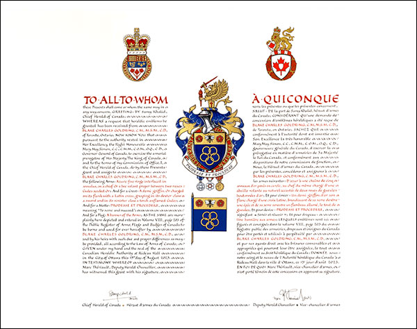 The contents of this Register are intended for research purposes only. The heraldic emblems found in the Register may not be reproduced in any form or in any media without the written consent of the Canadian Heraldic Authority and/or the recipient.