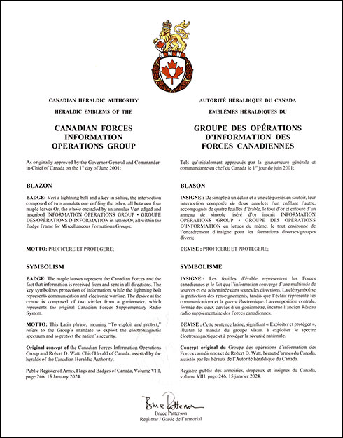 Additional InformationCreator(s)Original concept of the Canadian Forces Information Operations Group and Robert D. Watt, Chief Herald of Canada, assisted by the heralds of the Canadian Heraldic Authority. PainterRobert Grey CalligrapherJudith Bainbridge Recipient TypeMilitary Institution |
