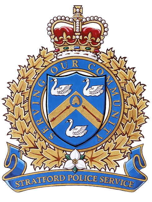Badge of the Stratford Police ServiceBlazonThe shield of Arms of The Corporation of the City of Stratford (Azure on a chevron Or between three swans naiant Argent a hurt charged with a beehive Or between two spears Gules their points upwards) within an annulus Azure fimbriated and inscribed SERVING OUR COMMUNITY in letters Or, ensigned with the Royal Crown proper and encircled by a wreath of maple leaves Or issuant from a trillium flower proper, all above a scroll Azure fimbriated and inscribed STRATFORD POLICE SERVICE in letters Or; SymbolismThe arms of the City of Stratford feature symbols honouring Stratford’s heritage, with the beehive symbol of industry, the spears from the arms of William Shakespeare, and the swans that can be seen on the Avon River. The Royal Crown symbolizes the fact that the department assists in the administration of the Crown’s justice, while the maple leaves and trillium flower are references to Canada and to Ontario. |