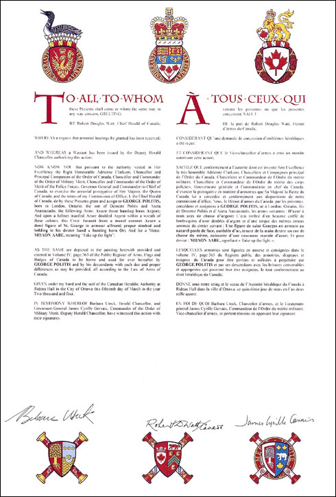 Additional InformationCreator(s)Original concept of Robert D. Watt, Chief Herald of Canada, assisted by the Heralds of the Canadian Heraldic Authority PainterLinda Nicholson CalligrapherShirley Mangione Recipient TypeIndividual |