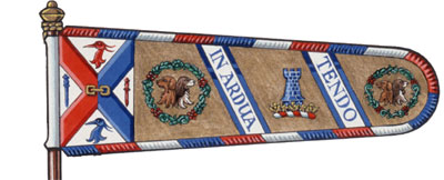 Flag of Thomas Ross Anthony MalcolmBlazonA standard, the Arms in hoist, the fly Or charged with the Crest between two representations of the Badge separated by two bends Argent fimbriated and inscribed with the Motto in letters Azure; SymbolismThe symbolism of this emblem is found in other element(s) of this record. |