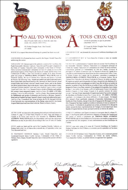 Additional InformationCreator(s)Original concept of Bruce Patterson, Saguenay Herald, assisted by the Heralds of the Canadian Heraldic Authority PainterGordon Macpherson CalligrapherJudith Bainbridge Recipient TypeIndividual |