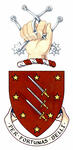 CrestBlazonA hand proper grasping two spurs in saltire rowels downward Argent; SymbolismA hand holding a spur is commonly used in crests of persons bearing the English surname Chutter. Here, two spurs are used. |