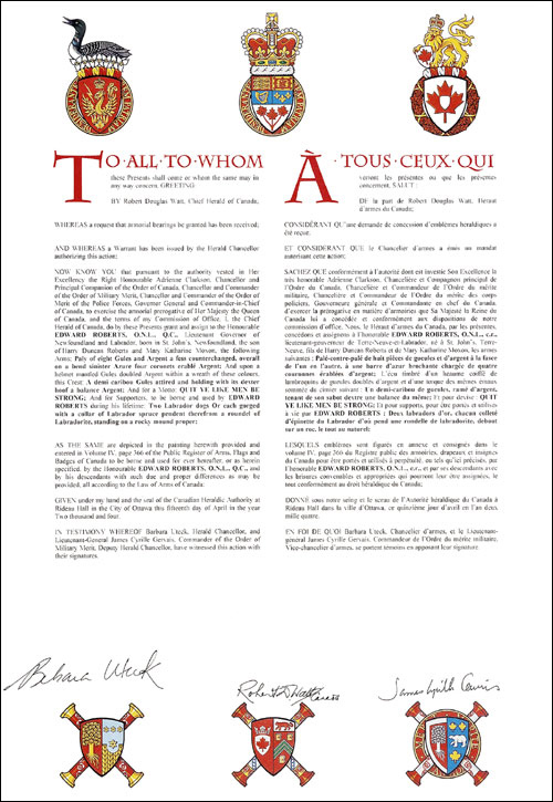 Additional InformationCreator(s)Original concept of Robert D. Watt, Chief Herald of Canada, assisted by the Heralds of the Canadian Heraldic Authority PainterGordon Macpherson CalligrapherKaren Mackay Recipient TypeIndividual Special DesignationLieutenant Governor |
