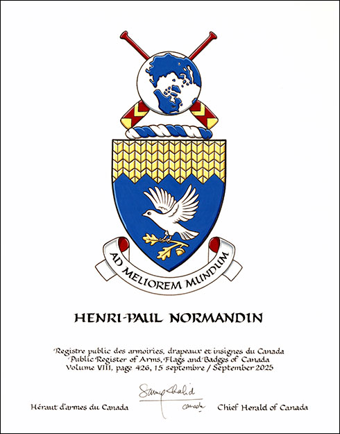 Arms of Henri-Paul NormandinBlazonAzure a dove volant Argent holding in its claws an oak branch, a chief dancetty tapissé of wheat Or; SymbolismBlue represents water, conveying Mr. Normandin’s passion for kayaking and for the St. Lawrence River. It is also the colour of Quebec, his place of origin, and of the United Nations, where he served for many years as Canada’s representative. Symbolizing peace and justice, the dove represents his legal education and his career focused on justice and human rights. The serrated division line alludes to mountains. Combined with the oak leaves, which reference his wife’s surname, they emphasize the love his family has for nature, as well as one of his sons’ career in forestry. Finally, the wheat recalls the agricultural roots of Mr. Normandin’s and his wife’s families. |