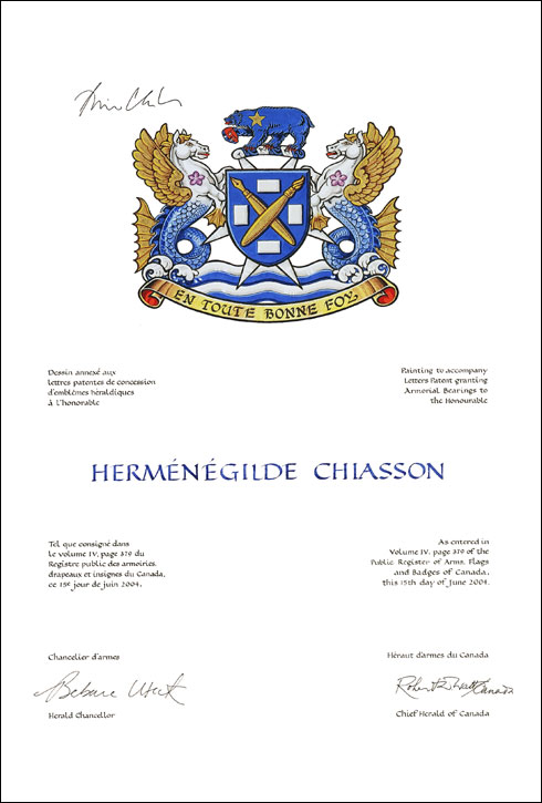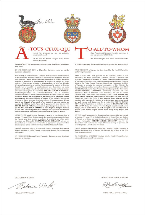 Additional InformationCreator(s)Original concept of Robert Pichette, Dauphin Herald Extraordinary, and Bruce Patterson, Saguenay Herald, assisted by the Heralds of the Canadian Heraldic Authority PainterGordon Macpherson CalligrapherShirley Mangione Recipient TypeIndividual Special DesignationLieutenant Governor |