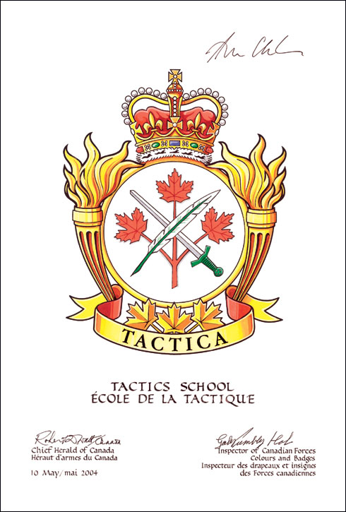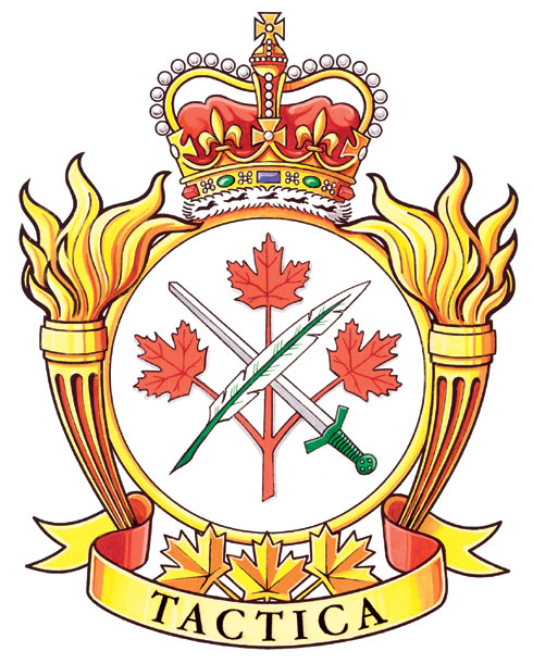 Badge of the Tactics SchoolBlazonArgent three maple leaves conjoined on one stem Gules surmounted in saltire by a sword proper hilted Vert and a quill Argent penned Vert; SymbolismThe red maple leaves on white identify the school as a Canadian unit. The sword indicates that it is an army unit, an idea reinforced by the green hilt. The quill is a symbol of the School's educational mission. |
