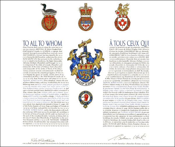 Arms of Thomas Alfred HickeyBlazonAzure a lion passant guardant Or charged on the shoulder with a maple leaf Gules, and on a chief Or three Redhead drakes' (Aythya americana) heads proper; SymbolismThe shield shows a gold lion on a blue field, as commonly found in the arms of members of the Hickey (or O’Hickey) family of County Clare, Ireland, from which Mr. Hickey is descended. The lion is charged with a red maple leaf to identify the arms as a Canadian branch of the family. At the top of the shield is a wide band or chief, also a common feature of the generic arms. However, the charges upon the gold chief are unique to Mr. Hickey. The duck’s head indicates his enthusiasm for duck-hunting, while its species – the Redhead – is an allusion to his red hair. The three duck heads refer to Mr. Hickey’s three children. |