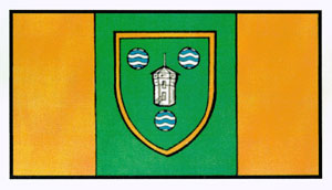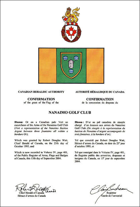 Flag of the Nanaimo Golf ClubBlazonOr on a Canadian pale Vert an escutcheon of the Arms of the Nanaimo Golf Club (Vert a representation of the Nanaimo Bastion Argent between three fountains all within a bordure Or); SymbolismThe colour green represents the lush grasses at the Nanaimo Golf Club course. The fountains are a reference to the water hazards golfers must negotiate. The representation of the Nanaimo Bastion symbolizes the historic building located in the City of Nanaimo, and emphasizes the golf course’s affinity to the city. |