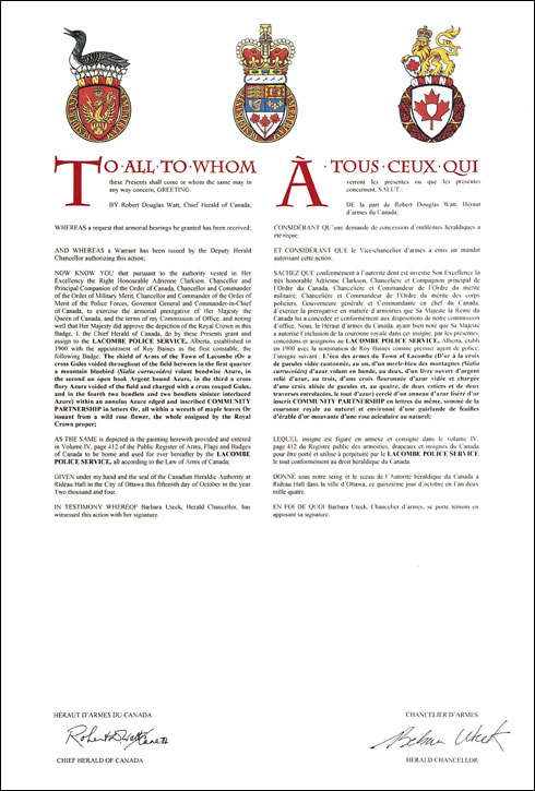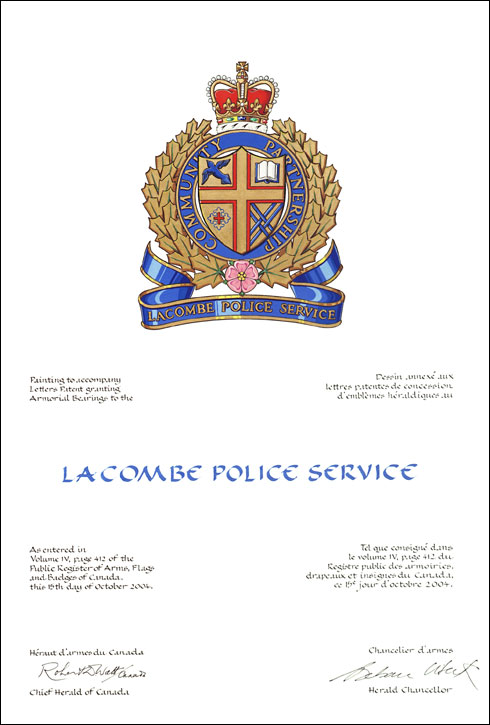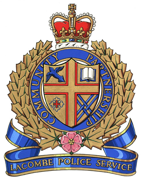 Badge of the Lacombe Police ServiceBlazonThe shield of Arms of the Town of Lacombe (Or a cross Gules voided throughout of the field between in the first quarter a mountain bluebird (Sialia currucoides) volant bendwise Azure, in the second an open book Argent bound Azure, in the third a cross flory Azure voided of the field and charged with a cross couped Gules, and in the fourth two bendlets and two bendlets sinister interlaced Azure) within an annulus Azure edged and inscribed COMMUNITY PARTNERSHIP in letters Or, all within a wreath of maple leaves Or issuant from a wild rose flower, the whole ensigned by the Royal Crown proper; SymbolismThe badge features the shield of arms of the Town of Lacombe. The various symbols on the shield represent the themes of Lacombe as an important crossroad, its namesake, the importance of the local institutions of learning and the significance of the Town as the birthplace of the Right Honourable Roland Michener, 20th Governor General of Canada. The shield is encircled by the Lacombe Police Service’s motto, COMMUNITY PARTNERSHIP. |
