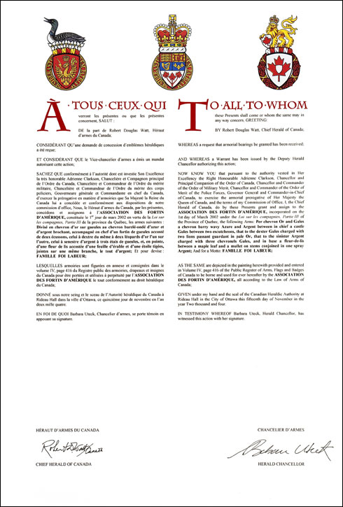 MottoBlazonFAMILLE FOI LABEUR; SymbolismThe motto meaning "Family, faith, work", is intended as a precept for all Fortins, past and present. |