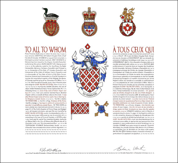 Additional InformationCreator(s)Original concept of Robert D. Watt, Chief Herald of Canada, assisted by the Heralds of the Canadian Heraldic Authority PainterDebra MacGarvie CalligrapherShirley Mangione Recipient TypeIndividual |