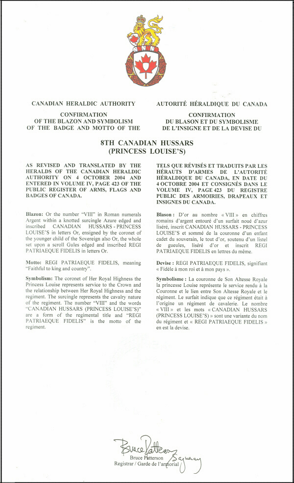 Badge of the 8th Canadian Hussars (Princess Louise's)BlazonOr the number “VIII” in Roman numerals Argent within a knotted surcingle Azure edged and inscribed CANADIAN HUSSARS - PRINCESS LOUISE’S in letters Or, ensigned by the coronet of the younger child of the Sovereign also Or, the whole set upon a scroll Gules edged and inscribed REGI PATRIAEQUE FIDELIS in letters Or. SymbolismThe coronet of Her Royal Highness the Princess Louise represents service to the Crown and the relationship between Her Royal Highness and the regiment. The surcingle represents the cavalry nature of the regiment. The number “VIII” and the words “CANADIAN HUSSARS (PRINCESS LOUISE’S)” are a form of the regimental title and “REGI PATRIAEQUE FIDELIS” is the motto of the regiment. |