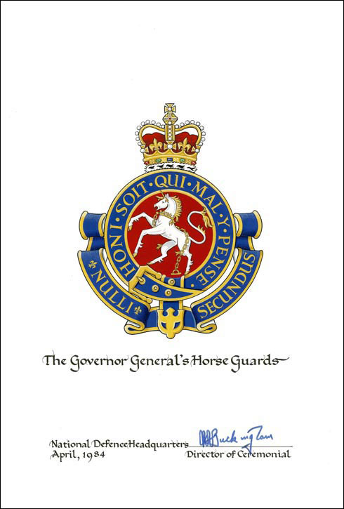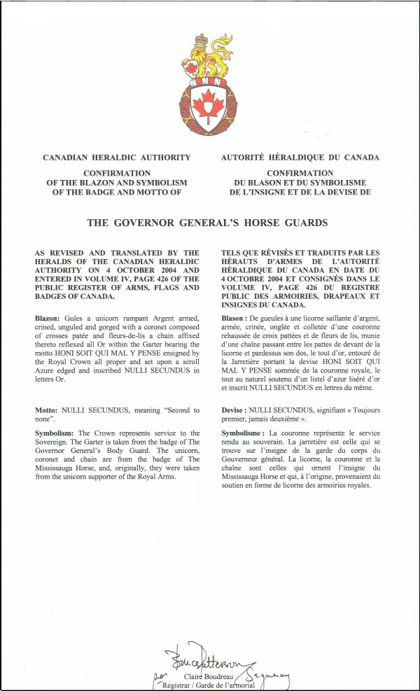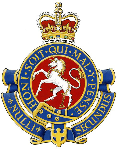 Badge of The Governor General's Horse GuardsBlazonGules a unicorn rampant Argent armed, crined, unguled and gorged with a coronet composed of crosses patée and fleurs-de-lis a chain affixed thereto reflexed all Or within the Garter bearing the motto HONI SOIT QUI MAL Y PENSE ensigned by the Royal Crown all proper and set upon a scroll Azure edged and inscribed NULLI SECUNDUS in letters Or. SymbolismThe Crown represents service to the Sovereign. The Garter is taken from the badge of The Governor General’s Body Guard. The unicorn, coronet and chain are from the badge of The Mississauga Horse, and, originally, they were taken from the unicorn supporter of the Royal Arms. |