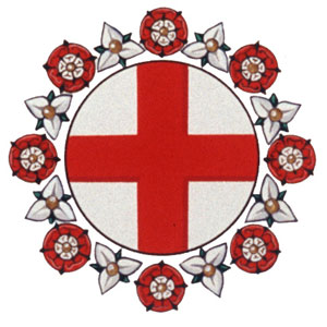 Badge of The St. George's Society of TorontoBlazonOn a plate a cross Gules, encircled alternately by Tudor roses and trillium flowers proper; SymbolismThe symbol of St. George is surrounded by trillium flowers, indicative of Ontario, and Tudor roses, a traditional English symbol that also combines the white rose of York (Toronto) with the red rose used by the Society. |