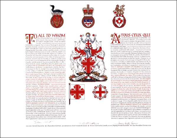 CrestBlazonA demi figure of St. George in armour affronté proper nimbed Or holding in the dexter hand a maple leaf Gules and a rose Argent and in the sinister hand a rose Gules and a trillium Argent; SymbolismThe use of St. George habited as a late medieval knight is easily recognizable in Western art. Here he is holding several floral symbols: the red maple leaf of Canada, the white trillium of Ontario, and white and red roses, which refer not only to England but to Toronto (the white rose is associated with York, the early 19th-century name of Toronto) and the Red Rose Ball, a major social event held by the Society. |