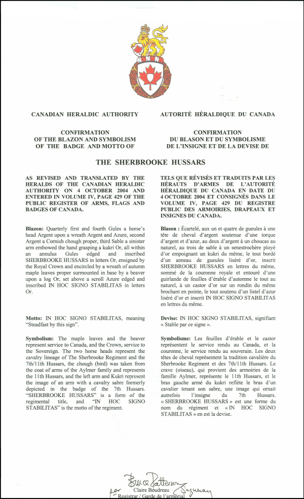 Badge of The Sherbrooke HussarsBlazonQuarterly first and fourth Gules a horse’s head Argent upon a wreath Argent and Azure, second Argent a Cornish chough proper, third Sable a sinister arm embowed the hand grasping a kukri Or, all within an annulus Gules edged and inscribed SHERBROOKE HUSSARS in letters Or, ensigned by the Royal Crown and encircled by a wreath of autumn maple leaves proper surmounted in base by a beaver upon a log Or, set above a scroll Sable edged and inscribed IN HOC SIGNO STABILITAS in letters Or. SymbolismThe maple leaves and the beaver represent service to Canada, and the Crown, service to the Sovereign. The two horse heads represent the cavalry lineage of The Sherbrooke Regiment and the 7th/11th Hussars, the chough (bird) was taken from the coat of arms of the Aylmer family and represents the 11th Hussars, and the left arm and Kukri represent the image of an arm with a cavalry sabre formerly depicted in the badge of the 7th Hussars. “SHERBROOKE HUSSARS” is a form of the regimental title and “IN HOC SIGNO STABILITAS” is the motto of the regiment. |