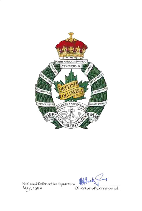 Badge of The British Columbia Regiment (Duke of Connaught's own)BlazonOn a maple leaf Vert resting upon a scroll Argent inscribed FRANCE FLANDERS 1915-18, two scrolls conjoined in pale Or inscribed BRITISH COLUMBIA, all above a bugle horn Argent and within a wreath of laurel Vert ensigned by the coronet of a younger son of the Sovereign proper, environed with a battle honour scroll Argent inscribed dexter VIMY 1917, SOMME 1916, FESTUBERT 1915, HINDENBURG LINE and sinister AMIENS, CANAL DU NORD, PASSCHENDAELE, DROCOURT-QUÉANT, the wreath surmounted below the coronet by two battle scrolls conjoined in pale Argent and inscribed SOUTH AFRICA 1899-1900 and YPRES 1915-17 and in base by a scroll Argent inscribed DUKE OF CONNAUGHT’S OWN RIFLES, all inscriptions in letters Sable. SymbolismThe coronet of His Royal Highness Prince Arthur represents the tie between the Duke of Connaught and the original regiment. The maple leaf and scrolls represent the perpetuation of the 7th Canadian Infantry Battalion, CEF. The bugle, laurel wreath and the inscription “DUKE OF CONNAUGHT’S OWN RIFLES” reflect the unit’s role as a rifle regiment from 1900 to 1920 and from 1930 to 1946. The battle honours represent the honours awarded to the regiment and its perpetuated units. |