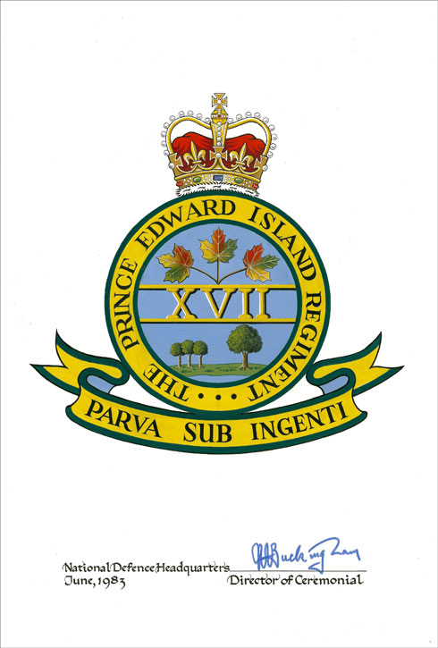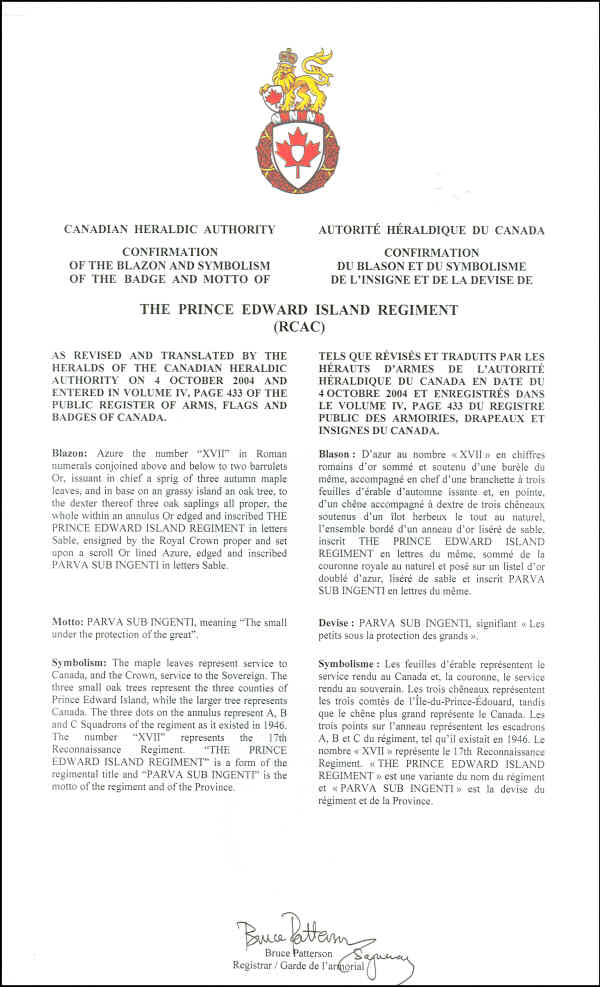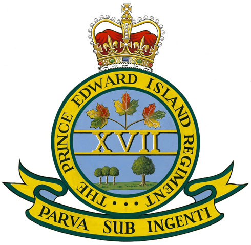 Badge of The Prince Edward Island Regiment (RCAC)BlazonAzure the number “XVII” in Roman numerals conjoined above and below to two barrulets Or, issuant in chief a sprig of three autumn maple leaves, and in base on an grassy island an oak tree, to the dexter thereof three oak saplings all proper, the whole within an annulus Or edged and inscribed THE PRINCE EDWARD ISLAND REGIMENT in letters Sable, ensigned by the Royal Crown proper and set upon a scroll Or lined Azure, edged and inscribed PARVA SUB INGENTI in letters Sable. SymbolismThe maple leaves represent service to Canada, and the Crown, service to the Sovereign. The three small oak trees represent the three counties of Prince Edward Island, while the larger tree represents Canada. The three dots on the annulus represent A, B and C Squadrons of the regiment as it existed in 1946. The number “XVII” represents the 17th Reconnaissance Regiment. “THE PRINCE EDWARD ISLAND REGIMENT” is a form of the regimental title and “PARVA SUB INGENTI” is the motto of the regiment and of the Province. |