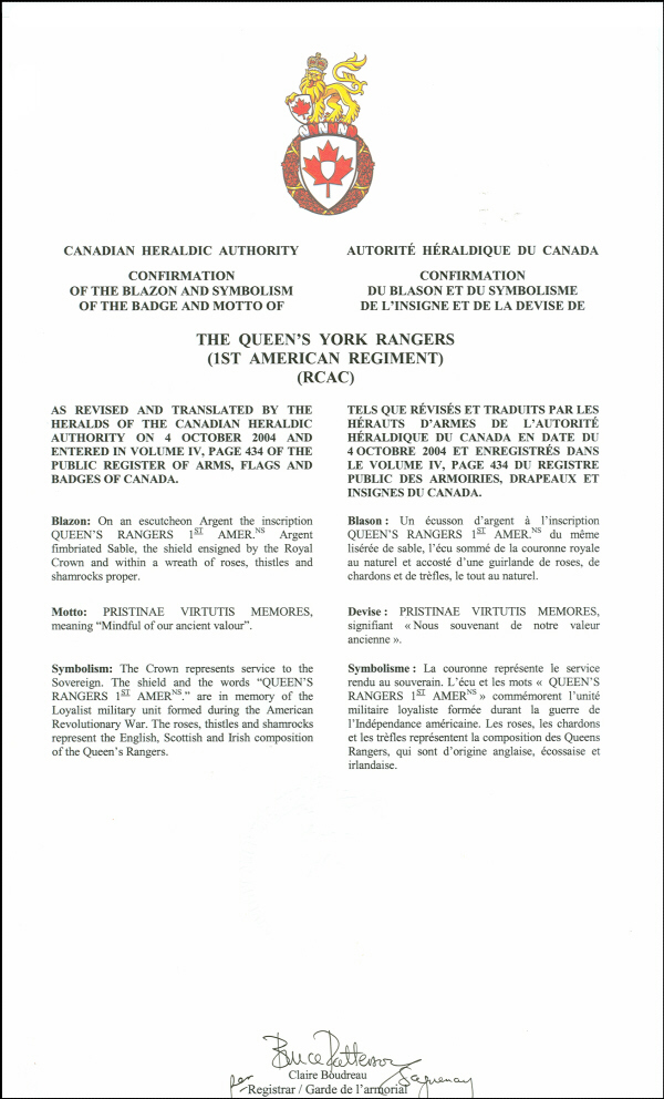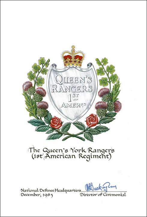 Badge of The Queen's York Rangers (1st American Regiment) (RCAC)BlazonOn an escutcheon Argent the inscription QUEEN’S RANGERS 1ST AMER.NS Argent fimbriated Sable, the shield ensigned by the Royal Crown and within a wreath of roses, thistles and shamrocks proper. SymbolismThe Crown represents service to the Sovereign. The shield and the words “QUEEN’S RANGERS 1ST AMERNS.” are in memory of the Loyalist military unit formed during the American Revolutionary War. The roses, thistles and shamrocks represent the English, Scottish and Irish composition of the Queen’s Rangers. |