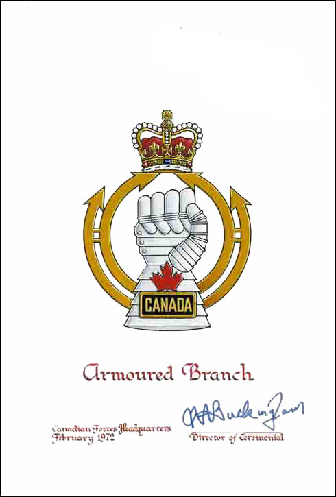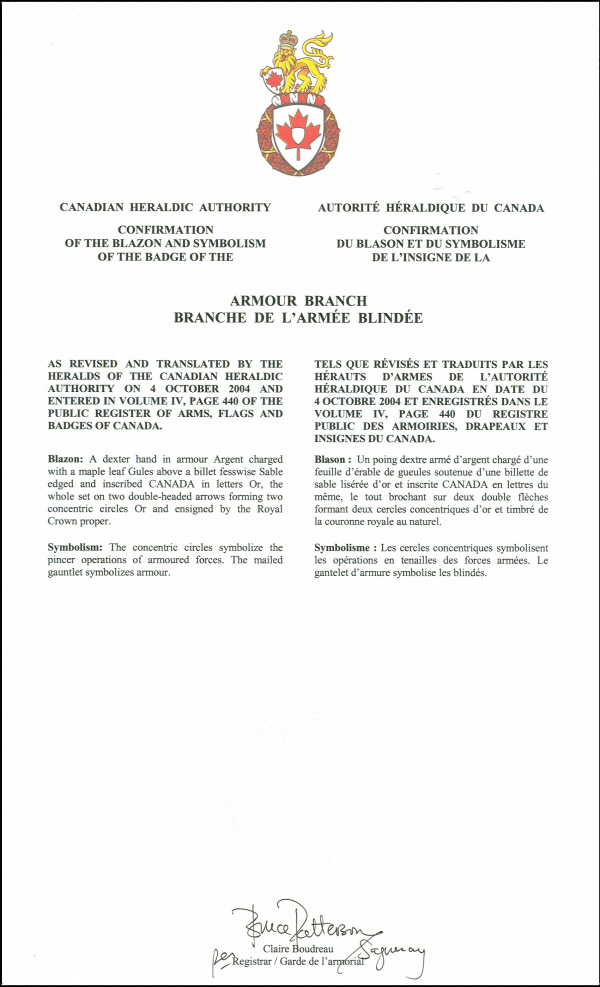 Badge of the Armour BranchBlazonA dexter hand in armour Argent charged with a maple leaf Gules above a billet fesswise Sable edged and inscribed CANADA in letters Or, the whole set on a double-headed arrows forming two concentric circles Or and ensigned by the Royal Crown proper. SymbolismThe concentric circles symbolize the pincer operations of armoured forces. The mailed gauntlet symbolizes armour. |