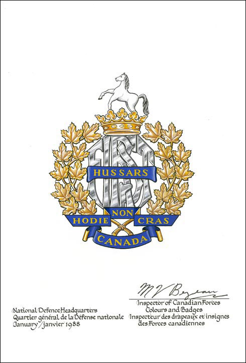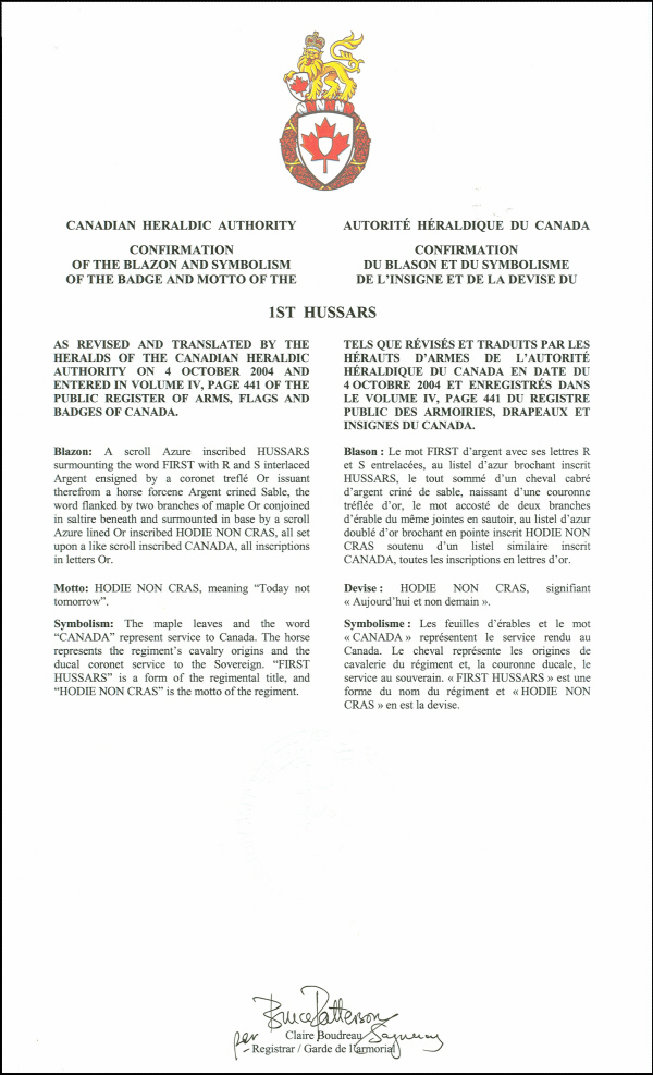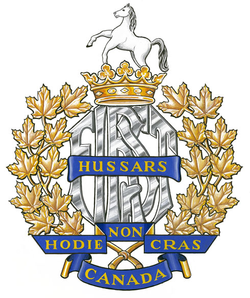 Badge of the 1st HussarsBlazonA scroll Azure inscribed HUSSARS surmounting the word FIRST with R and S interlaced Argent ensigned by a coronet treflé Or issuant therefrom a horse forcene Argent crined Sable, the word flanked by two branches of maple Or conjoined in saltire beneath and surmounted in base by a scroll Azure lined Or inscribed HODIE NON CRAS, all set upon a like scroll inscribed CANADA, all inscriptions in letters Or. SymbolismThe maple leaves and the word “CANADA” represent service to Canada. The horse represents the regiment’s cavalry origins and the ducal coronet service to the Sovereign. “FIRST HUSSARS” is a form of the regimental title and “HODIE NON CRAS” is the motto of the regiment. |