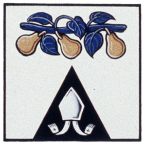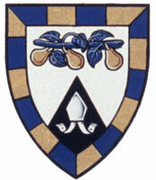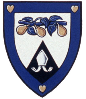 Arms of Harold Robert PeerenboomBlazonArgent on a pile transposed Sable a simple mitre (mitra simplex) Argent, in chief a pear tree branch Azure fructed Or; SymbolismThe pears make a reference to the name Peerenboom. The mitre refers to Abbotshall, Mr. Peerenboom's Scottish barony. |