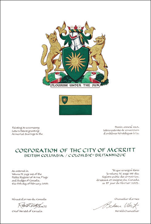 Arms of the Corporation of the City of MerrittBlazonVert a sun in splendour Or; SymbolismGreen and gold are the city colours, representing the verdant Nicola Valley and sunlight. The sun is a dominant feature of the valley: a symbol of power, splendour and justice, and a reference to the sun in the arms of British Columbia. Green also represents growth and hope. |
