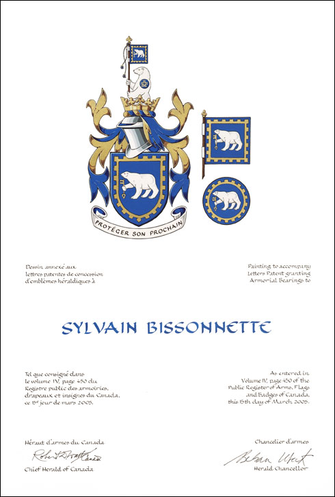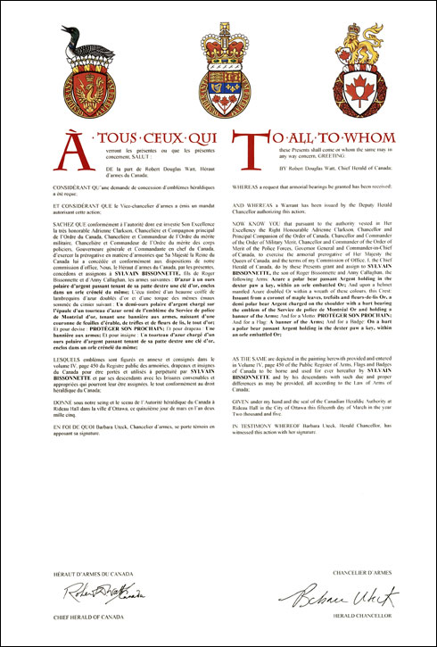 Arms of Sylvain BissonnetteBlazonAzure a polar bear passant Argent holding in the dexter paw a key, within an orle embattled Or; SymbolismThe polar bear, present in the shield and crest, is the animal that best personifies Mr. Bissonnette. Polar bears are tremendous hunters that, much like police officers, work in hostile territories in pursuit of their goal. Although peaceful by nature, polar bears do not hesitate to defend their territory and cubs. The polar bear also refers to Mr. Bissonnette's place of birth and residence, Montréal-Nord. The key being held in its paw is a symbol of the city's openness and of the past, which represents Mr. Bissonnette's work as a police officer and historian. The shield also includes a crenellated edge symbolizing the city territory and the protection of citizens. It also recalls that Montreal used to be a fortified city. |