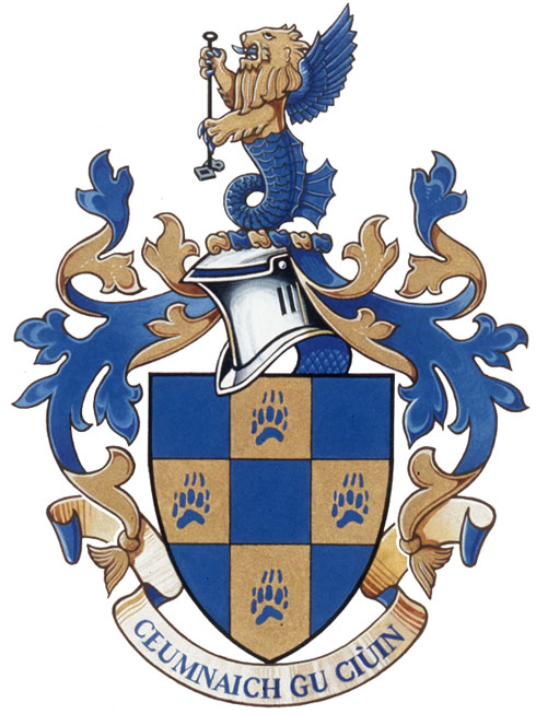 MottoBlazonCEUMNAICH GU CIÙIN; SymbolismThis Scots Gaelic phrase can be interpreted as either "Walk softly" or "Tread lightly", implying the importance of acting with care. It also connects to the paw prints in the arms. |
