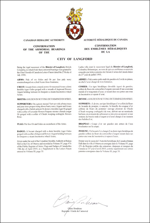 CrestBlazonIssuant from a mural crown Or masoned Azure a demi heraldic tyger Gules gorged with a wreath of dogwood flowers Argent holding between its forepaws a steam locomotive wheel Azure; SymbolismThe mural coronet denotes that these are the arms of a municipality. Springing forth from the coronet is a heraldic “tyger” based on Captain Langford’s crest. It wears a collar of white dogwood flowers, British Columbia’s official flower. The tyger holds a steam locomotive wheel in its forepaws alluding to the historic Esquimalt and Nanaimo Railway and the ongoing importance of the transport industry in the community. |
