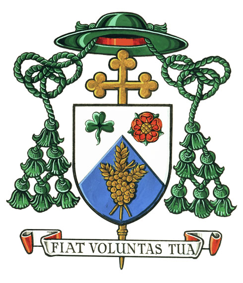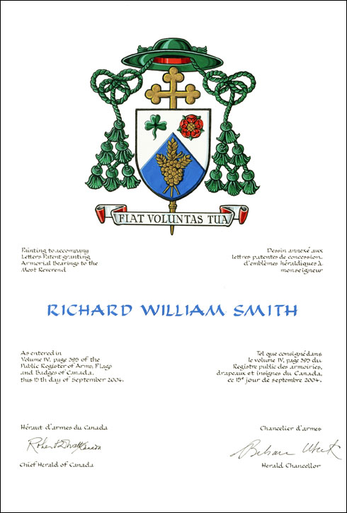 Arms of Richard William SmithBlazonPer chevron Argent and Azure, in chief a trefoil Vert and a rose Gules barbed and seeded proper, in base three ears of wheat bound and surmounted by a cluster of grapes Or; SymbolismThe shamrock refers to Bishop Smith’s maternal Irish ancestry, and the rose to his paternal English ancestry. The wheat and grapes represent the Eucharist, the source and summit of the Christian life. Blue is the colour traditionally associated with the Blessed Virgin Mary. |