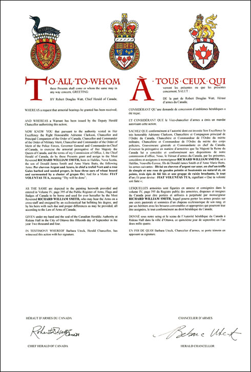 Additional InformationCreator(s)Original concept of Gordon Macpherson, Niagara Herald Extraordinary, assisted by the Heralds of the Canadian Heraldic Authority PainterGordon Macpherson CalligrapherDoris Wionzek Recipient TypeIndividual |