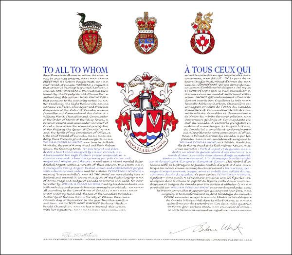 Additional InformationCreator(s)Original concept of Darrel Kennedy, Assiniboine Herald, assisted by the Heralds of the Canadian Heraldic Authority PainterDebra MacGarvie CalligrapherNancy Ellis Recipient TypeIndividual |