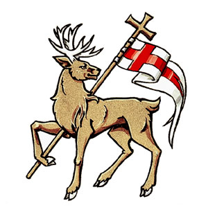 Badge of The Faculty of Divinity of the University of Trinity CollegeBlazonA stag trippant reguardant Or attired and unguled Argent supporting with the dexter foreleg a staff terminating in a cross Or flying therefrom a pennon Argent charged with a cross Gules; SymbolismThe first badge is patterned after the Agnus Dei, a Christian symbol of a lamb bearing a cross and banner, but uses instead the stag from the arms. The flag serves to denote “bearing Christ” but in this particular form is also an historical reference to the flag of the Church of England and thus to Anglicanism. |