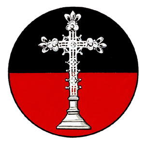 Badge of The Faculty of Divinity of the University of Trinity CollegeBlazonOn a roundel per fess Sable and Gules, an altar cross Argent; SymbolismThe second badge uses the colours and a representation of the cross used on the altar of the Lady Chapel of the college. This cross has been used continuously since the earliest years of the college. |