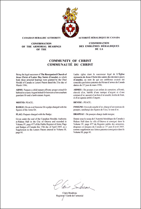 Other InformationThe recipient's emblems have been originally recorded on 21 March 1996 in Volume III, page 81 of the Public Register of Arms, Flags and Badges of Canada. |