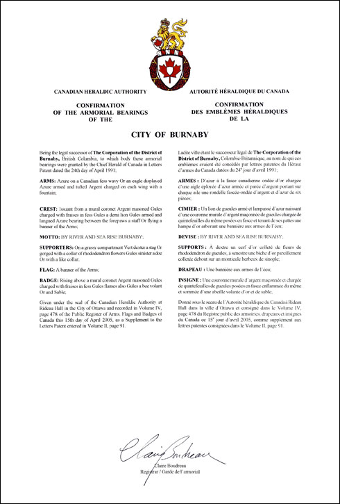 Letters Patent confirming the Armorial Bearings of the City of BurnabyBlazonAzure on a Canadian fess wavy Or an eagle displayed Azure armed and tufted Argent charged on each wing with a fountain; SymbolismNot applicable |