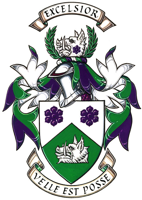 Arms of the Hillfield Strathallan CollegeBlazonPer chevron Argent and Vert, in chief two sexfoils Purpure, in base a boar’s head couped Argent; SymbolismThe boar's head was the symbol of Hillfield School, and was likely taken from the personal arms of Lord Aberdeen, Governor General of Canada and an early patron of the school. The flowers, which may have been based on prairie crocus flowers, and the purple colour were used by Strathallan School, along with the colour green, which was also used by Hillfield. Green, purple and white are the colours of the present school. The chevron division alludes to Hamilton Mountain, the school's location. |
