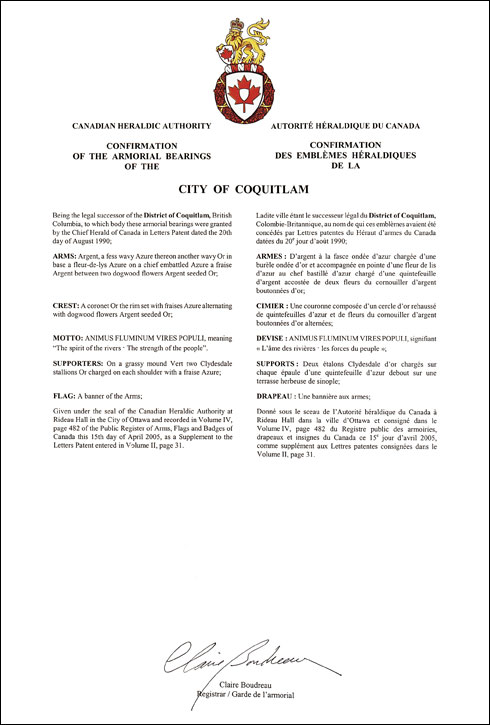 Letters Patent confirming the Armorial bearings of the City of CoquitlamBlazonArgent, a fess wavy Azure thereon another wavy Or in base a fleur-de-lys Azure on a chief embattled Azure a fraise Argent between two dogwood flowers Argent seeded Or; SymbolismNot applicable |