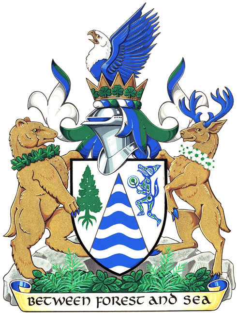 SupportersBlazonDexter a bear Or armed Azure gorged with a collar of maple leaves Vert, sinister a stag Or attired and unguled Azure gorged with a collar of dogwood flowers Argent leaved and seeded Vert, both standing on a rock set with salal leaves and sword ferns proper; SymbolismThe bear and stag allude to Belcarra’s natural heritage. The collars are a reference to Belcarra as a British Columbian and Canadian municipality. The gold refers to the light and warmth of the community’s spirit. The salal plants, sword ferns and rock continue to celebrate Belcarra’s geographical features. |