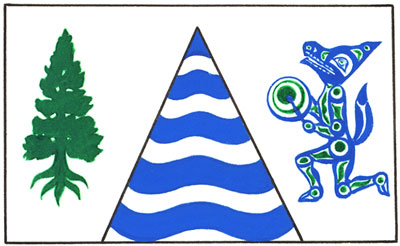 Arms of the Village of BelcarraBlazonArgent a pile reversed barry wavy Azure and Argent between a conifer eradicated Vert and a wolf in the Salish style rampant beating a drum all Azure, Vert and Argent; SymbolismThe colours blue, white and green link the shield with the current Belcarra emblem. The triangle represents the waters of the Indian Arm, and the conifer also recalls the present emblem. The ancient presence of the First Nations in and around Belcarra is symbolized by the Salish wolf, associated with the wolf clan (children of Takaya) of the Tsleil-Waututh First Nation, known as “The People of the Inlet.” |