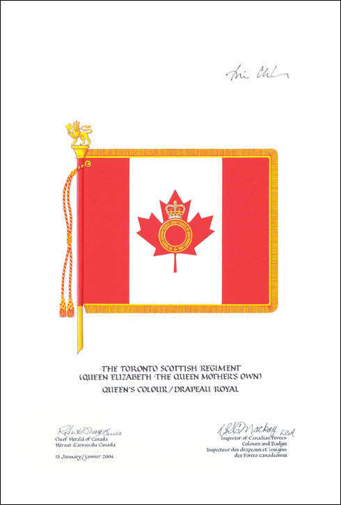 Queen's Colour of The Toronto Scottish Regiment (Queen Elizabeth The Queen Mother's Own)BlazonGules on a Canadian pale Argent a maple leaf charged with an annulus Gules edged, charged in base with a thistle, inscribed THE TORONTO SCOTTISH REGIMENT (QUEEN ELIZABETH THE QUEEN MOTHER'S OWN) in letters Or and ensigned with the Royal Crown proper; SymbolismNot applicable |