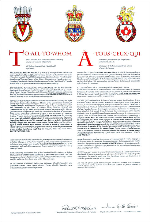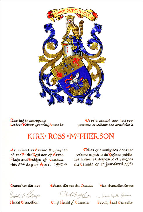 Additional InformationCreator(s)Original concept of Gordon Macpherson, assisted by the Heralds of the Canadian Heraldic Authority PainterGordon Macpherson CalligrapherGordon Macpherson Recipient TypeIndividual |