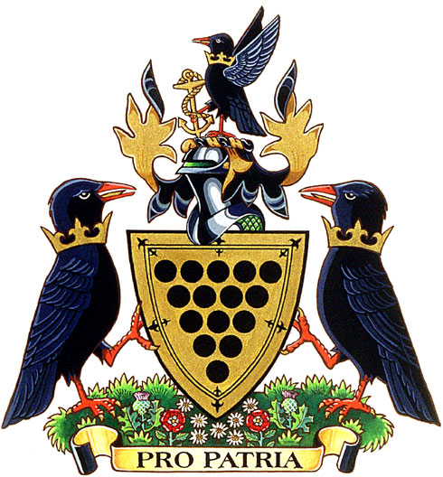 Arms of the City of CornwallBlazonOr fifteen roundels in pile within a double tressure flory Sable; SymbolismThe colours and discs are based on the Arms of the Duchy of Cornwall, England. The fifteen discs are surrounded by a pair of narrow bands known as a double tressure flory, a version of which appears in the Arms of the King of Scotland and honours the first Scottish settlers of this region. The parallel bands recall the two row wampum belts presented to the early settlers by the Indigenous peoples. The fleurs-de-lis recognize the French heritage of the City of Cornwall. |