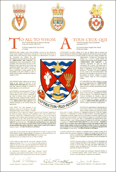 Arms of the Association des LeBlancBlazonPer saltire first and fourth barry wavy Argent and Azure in chief a star in base an ancient barque in full sail flying a pennon all Or second and third Gules dexter a lily flower Argent sinister a garb of five stalks Or; SymbolismThe colours allude to those of the flag of Acadia. The wavy bars symbolize the ocean that was crossed by the first ancestor of the LeBlancs and also refer to the many voyages undertaken by the descendents of this family, notable during the Acadian deportation. The reference to the ocean is also an allusion to Port Royal (now Annapolis Royal), a settlement central to the first immigrants of the LeBlanc family, Daniel LeBlanc and Françoise Gaudet (married in 1650) and the history of Canada. The gold star and the ancient sailing vessel were adopted as official symbols of the Acadian people at the National Convention of Acadians at Miscouche in 1884. The star represents the patron saint of Acadians, Our Lady of the Assumption. The garb of wheat honours the occupation of Daniel LeBlanc, a farmer, and the ears of wheat are a reference to his five sons. The garden lily plays a dual purpose: it recalls the French origins of the LeBlanc family, and the flower’s white colour connects to the name LeBlanc. |