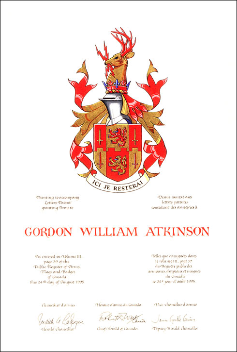Arms of Gordon William AtkinsonBlazonPer fess embattled Gules and Or on a Canadian pale per fess embattled between four swords two lions all counterchanged; SymbolismThe red and gold lions are taken from those found on the coats of arms of Scotland and England respectively. The four swords indicate the four generations of men from the Gordon family who have served in the military. The embattled division signifies the defence of one’s inherent rights and the Canadian pale is a reference to Canada. |