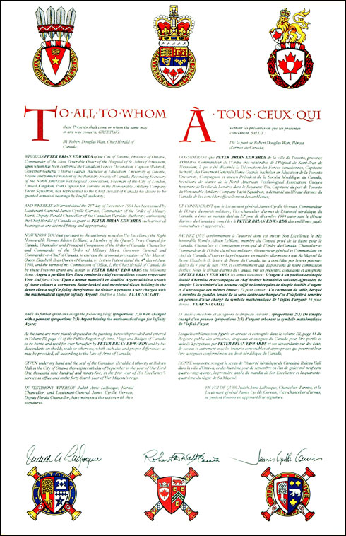 Additional InformationCreator(s)Original concept by Peter Edwards, assisted by the Heralds of the Canadian Heraldic Authority PainterGordon Macpherson CalligrapherJudith Bainbridge Recipient TypeIndividual |