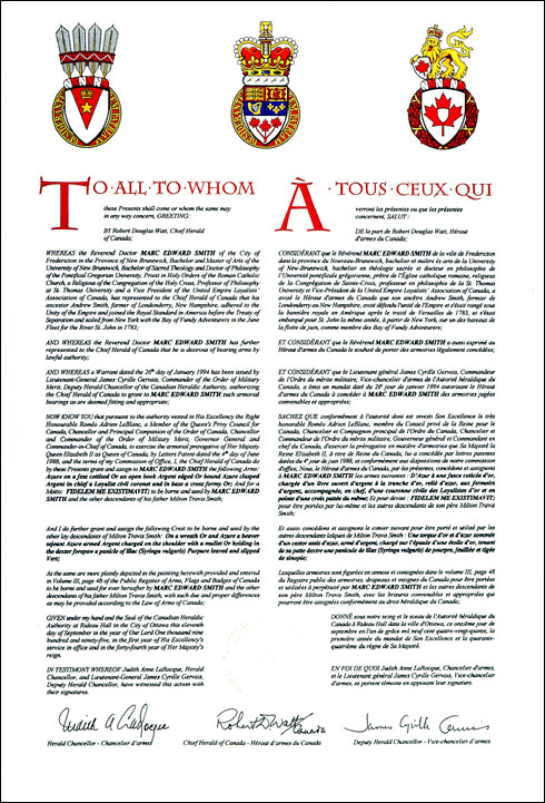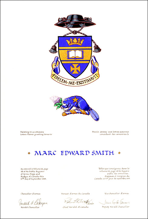 Arms of Marc Edward SmithBlazonAzure on a fess cottised Or an open book Argent edged Or bound Azure clasped Argent in chief a Loyalist civil coronet and in base a cross formy Or; SymbolismThe Loyalist civil coronet honours Fr. Smith’s loyalist heritage dating to Andrew Smith, who settled in Sunbury County, New Brunswick in 1783. The open book symbolizes the life of scholarship and teachings which Fr. Smith practises as a professor at St. Thomas University, Fredericton. The cross is a reference to his profession as a priest of the Roman Catholic Church, and the Christian and loyalist heritage of his family. |