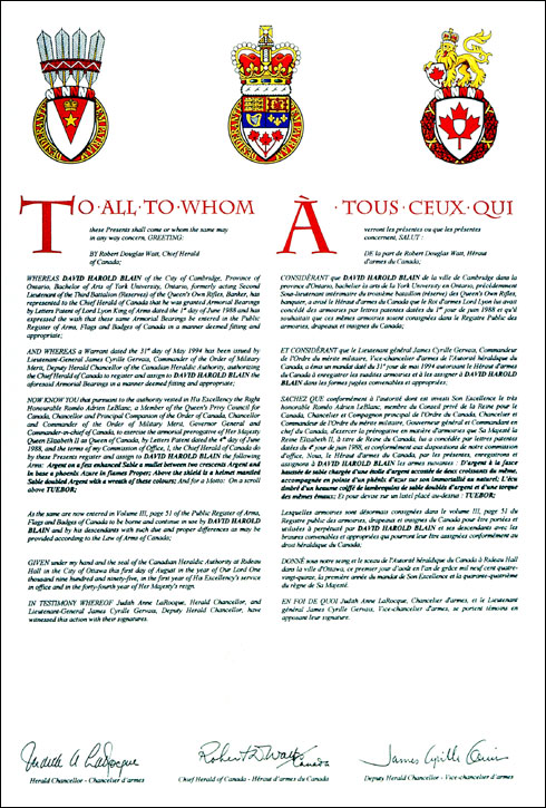 The contents of this Register are intended for research purposes only. The heraldic emblems found in the Register may not be reproduced in any form or in any media without the written consent of the Canadian Heraldic Authority and/or the recipient.